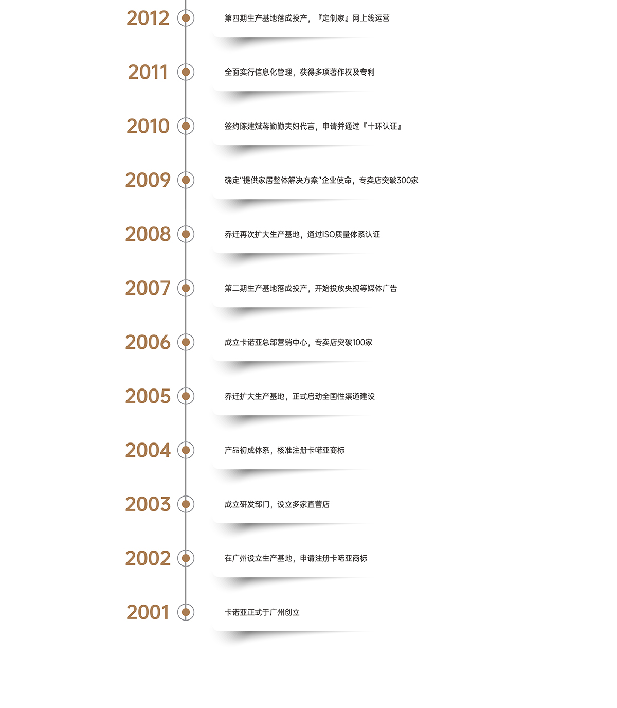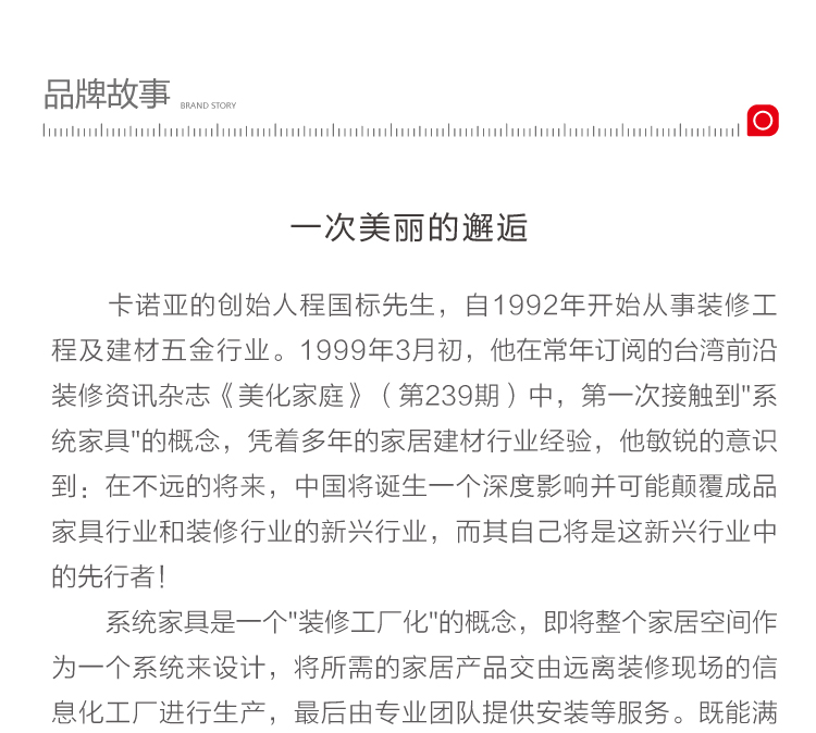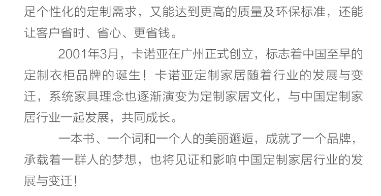 卡諾亞創立于2001年,是集研發、設計、生產和服務于一體的高新技術企業。旗下擁有居魔方整裝、卡諾亞高端定制、羅亞全屋定制三大品牌。