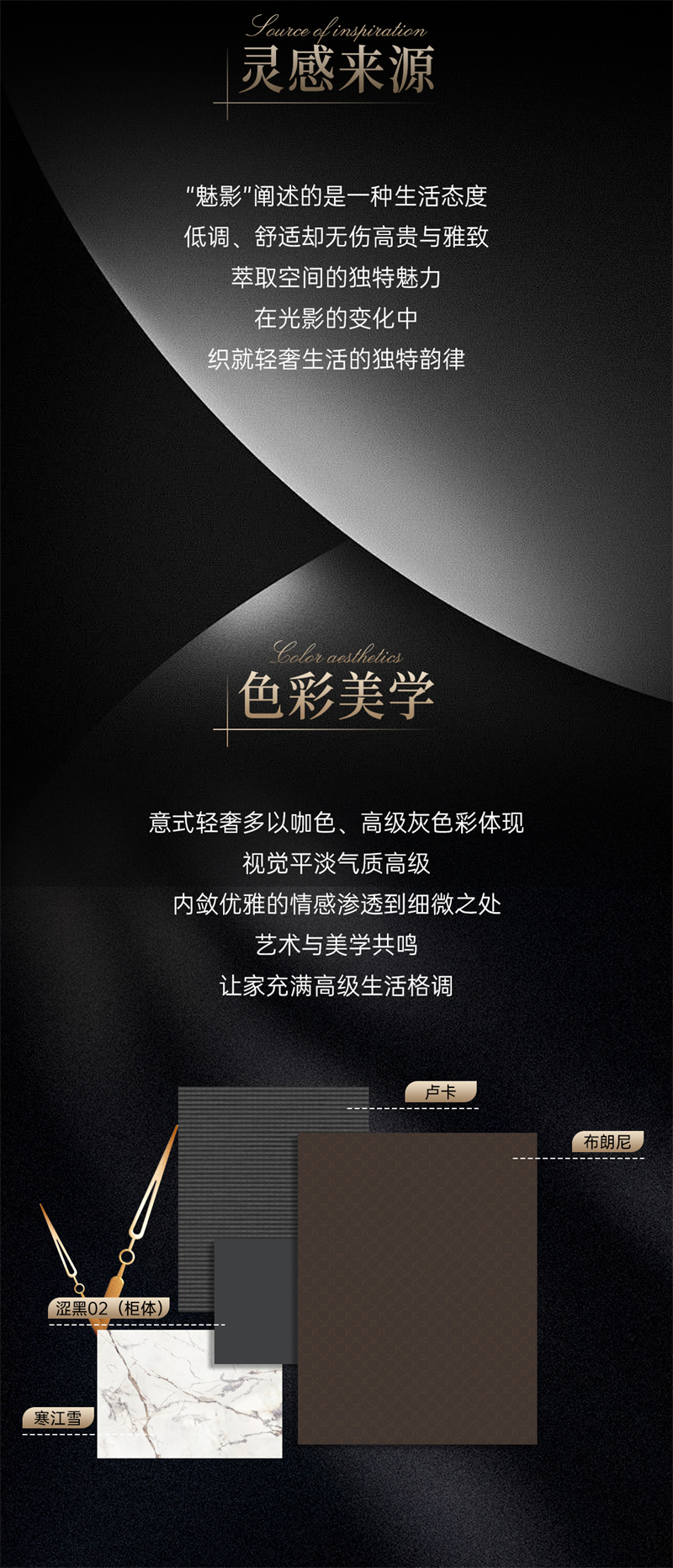 魅影系列所闡述的是一種生活態度,以及一種追求品質和精致生活的生活狀態,低調、舒適卻無傷高貴與雅致,萃取意式輕奢靈韻,精準勾勒空間輪廓,刪繁就簡,織就獨特韻律。